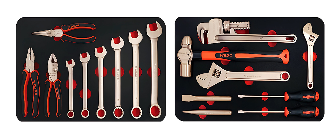 Las herramientas de bronce se elaboran a partir de una aleación no ferrosa compuesta principalmente de cobre y estaño, a veces combinada con aluminio o berilio para aumentar su resistencia. Esta composición de materiales logra evitar que se generen chispas, incluso al golpear o raspar superficies metálicas.